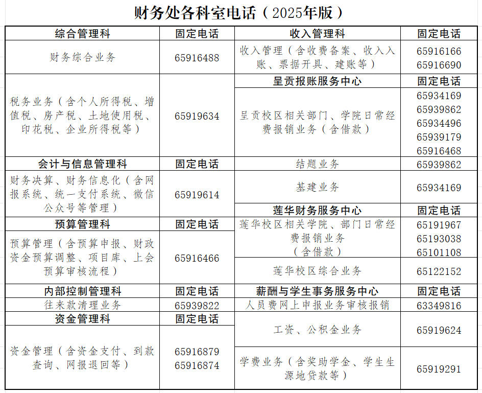 财务处各科室电话(2025年版)