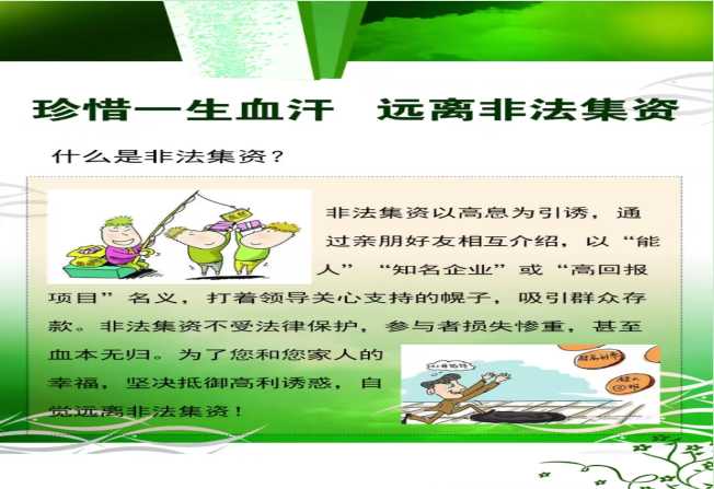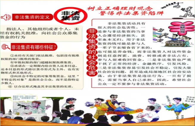 一是静态宣传。在财务处宣传栏上上墙相防范非法集资工作,从“什么是非法集资”、“非法集资的典型形式”、 “揭穿非法集资的外衣”、“典型案例”四方面内容进行了表述,通过图文并茂的方式向学校学校师生宣传了非法集资的危害、增强了对非法集资的防范意识。