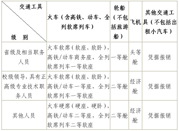 第六条出差人员应当按照规定等级乘坐交通工具,凭据报销城市间交通费。未按规定等级乘坐交通工具的,超支部分由个人自理。出差人员乘坐交通工具的等级见下表: